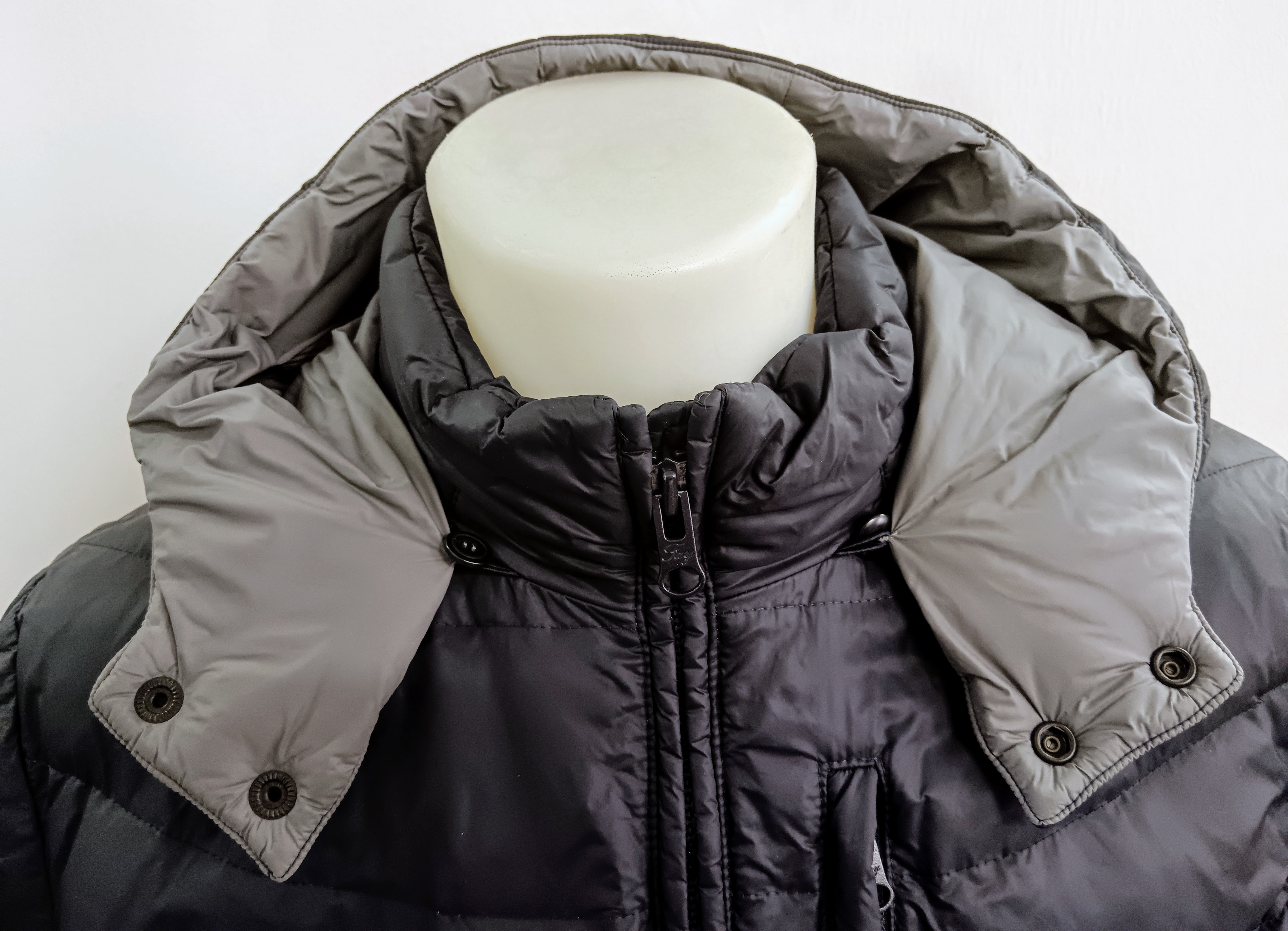 Modello iconico, intramontabile, pratico e versatile. Cappuccio staccabile. Tre tasche a taglio frontali chiuse con cerniere più una interna. Interno in nylon grigio. L'etichetta interna è stata tagliata. Polsini in tessuto elasticizzato.