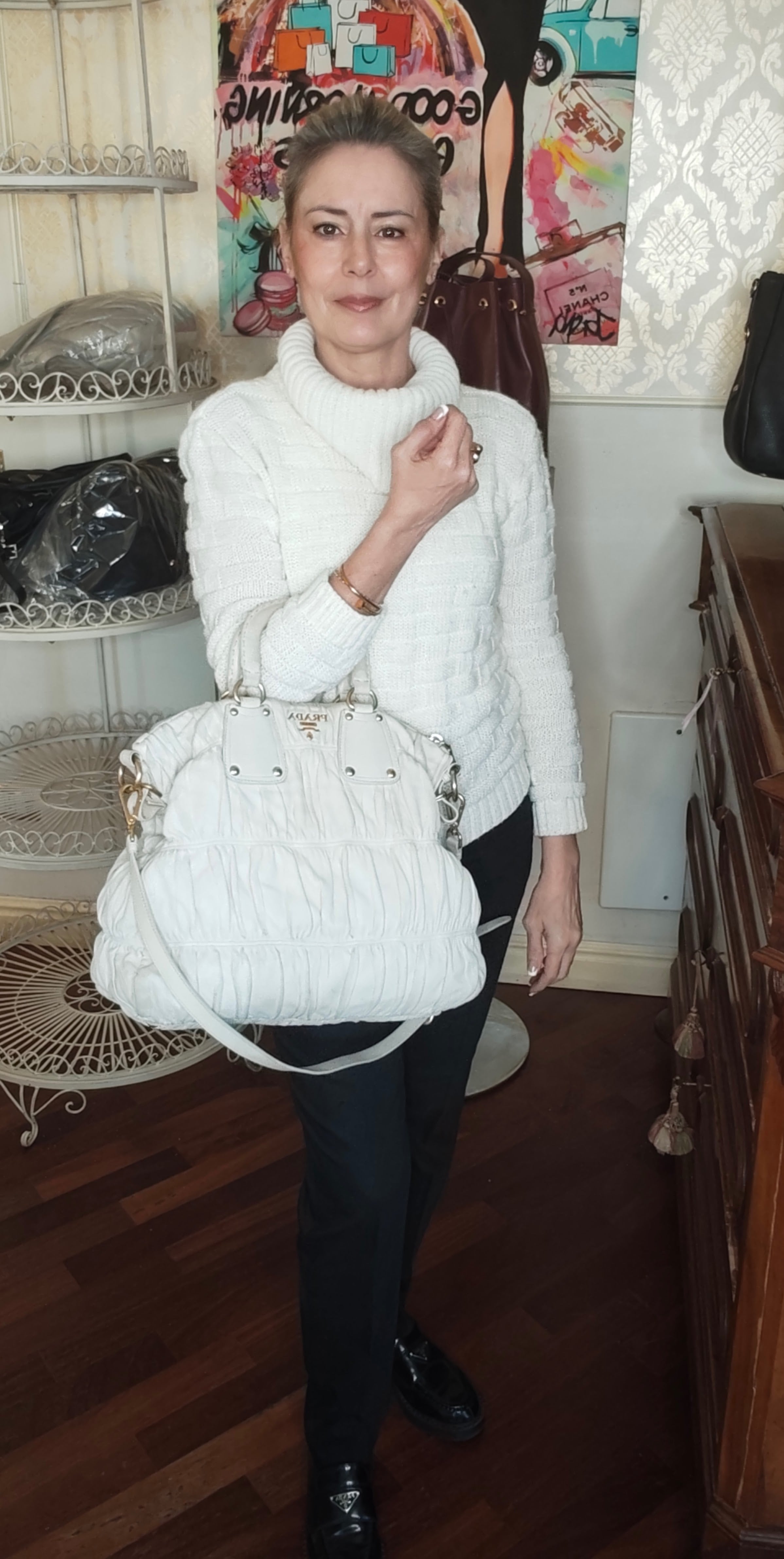 Realizzata in elegante pelle goffrata color avorio/burro, rappresenta una vera rarità nel mercato second hand: le tonalità chiare, infatti, sono spesso soggette a usura (in particolare l’annerimento dei manici), ma questo esemplare si distingue per le sue condizioni eccellenti, essendo stato utilizzato pochissimo.