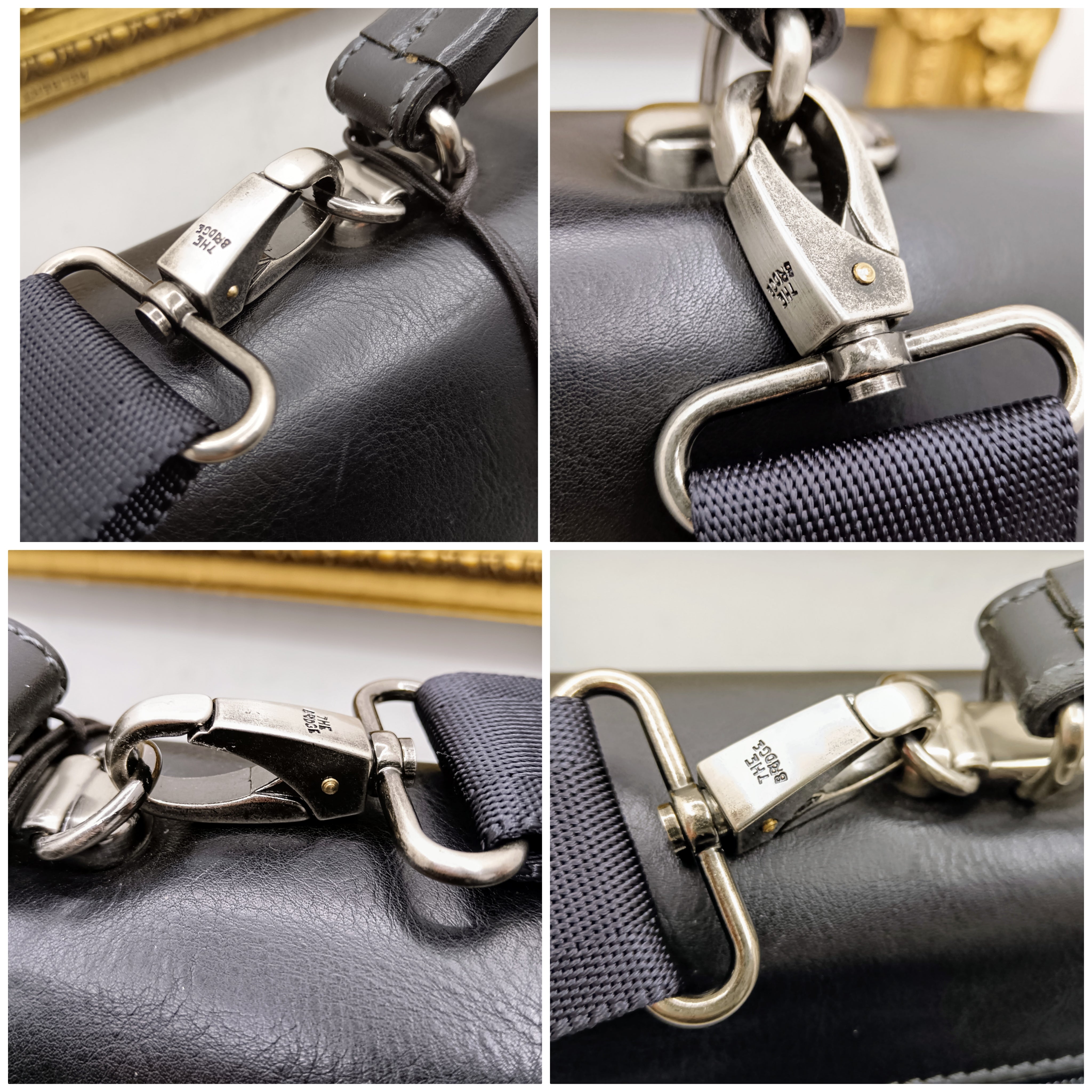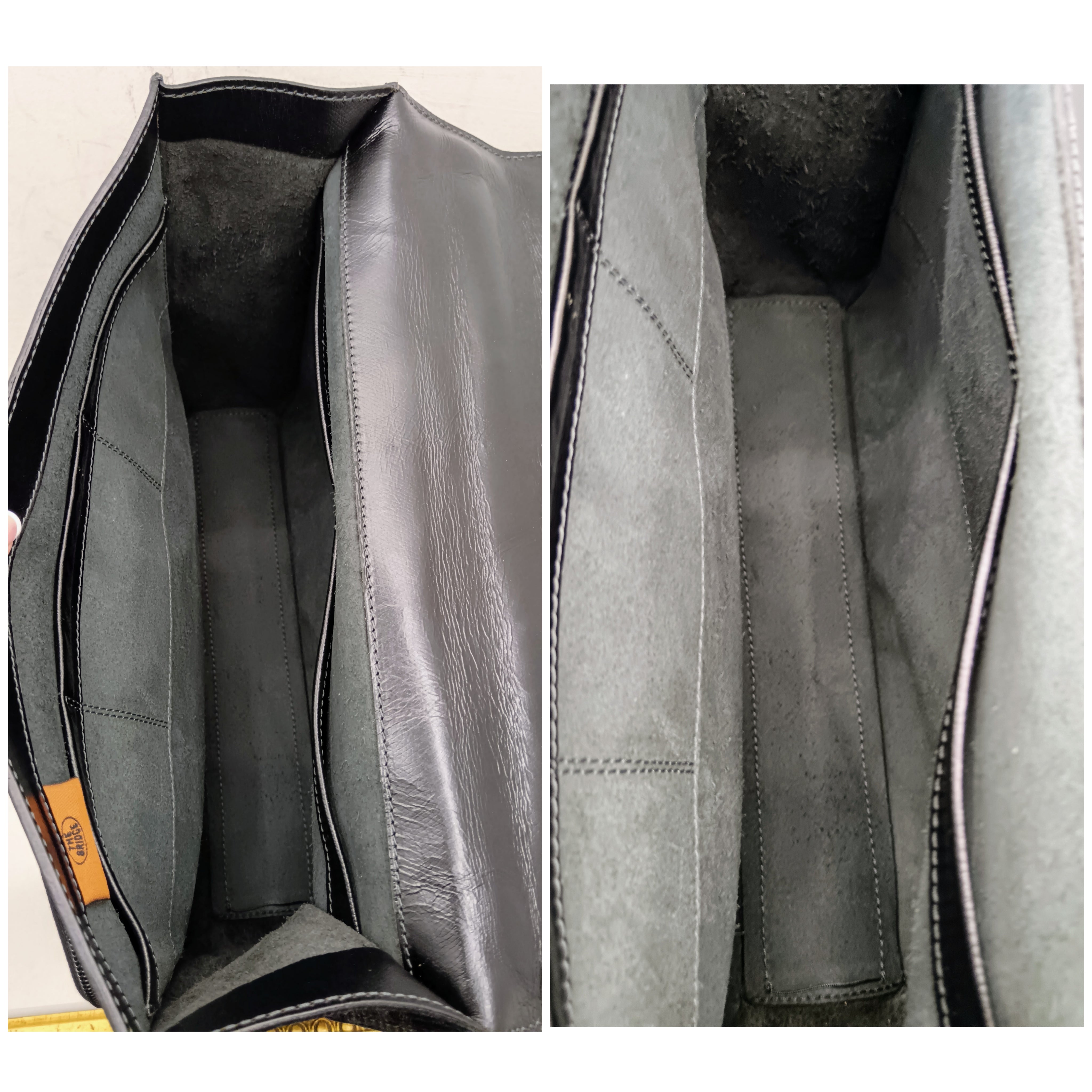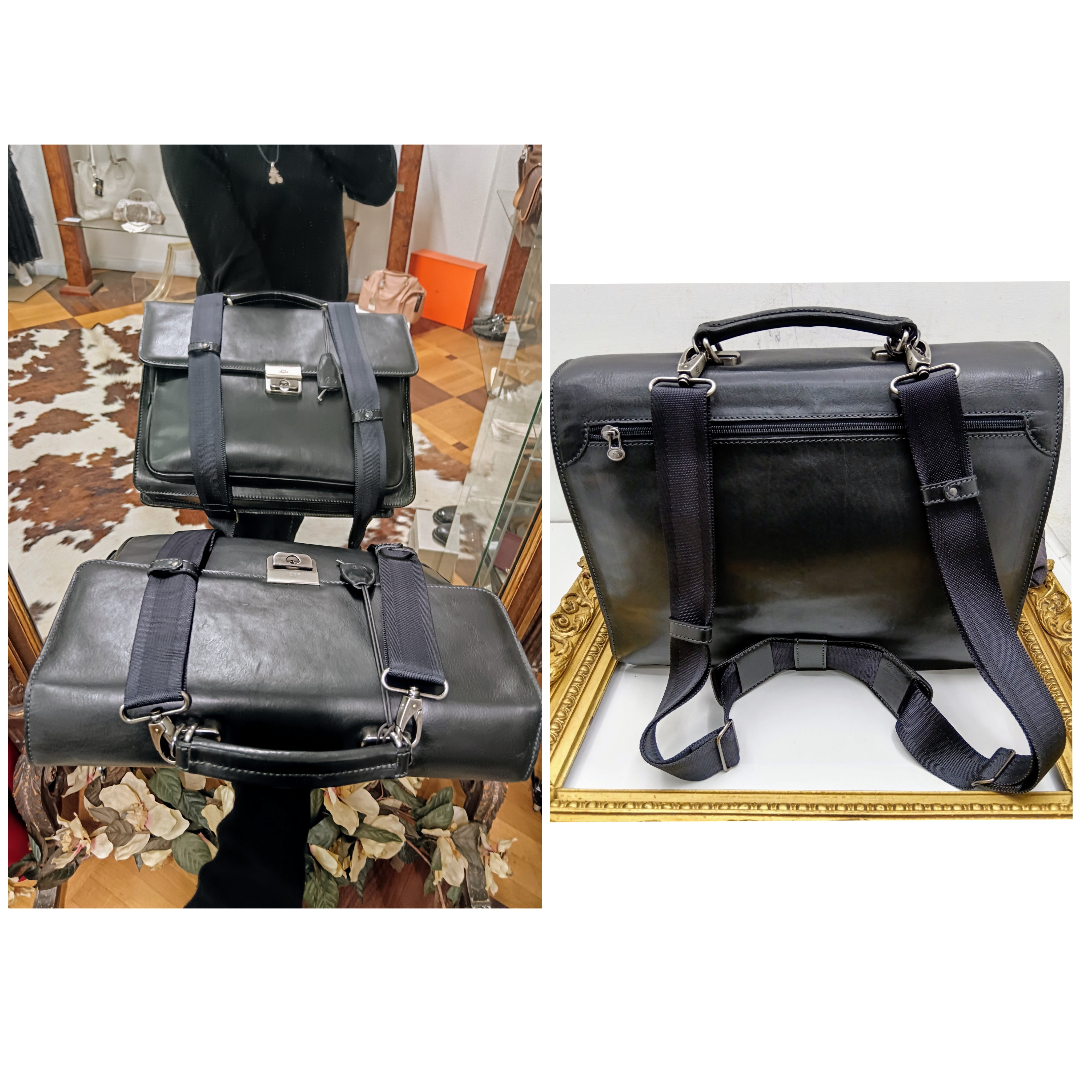 Iconica ed elegante cartella da lavoro in pelle nera, ultimo e nuovo modello con portabilità a zaino: la tracolla classica regolabile si può infilare nel passante posteriore per creare due spallacci che consentono di indossarla come zaino.
