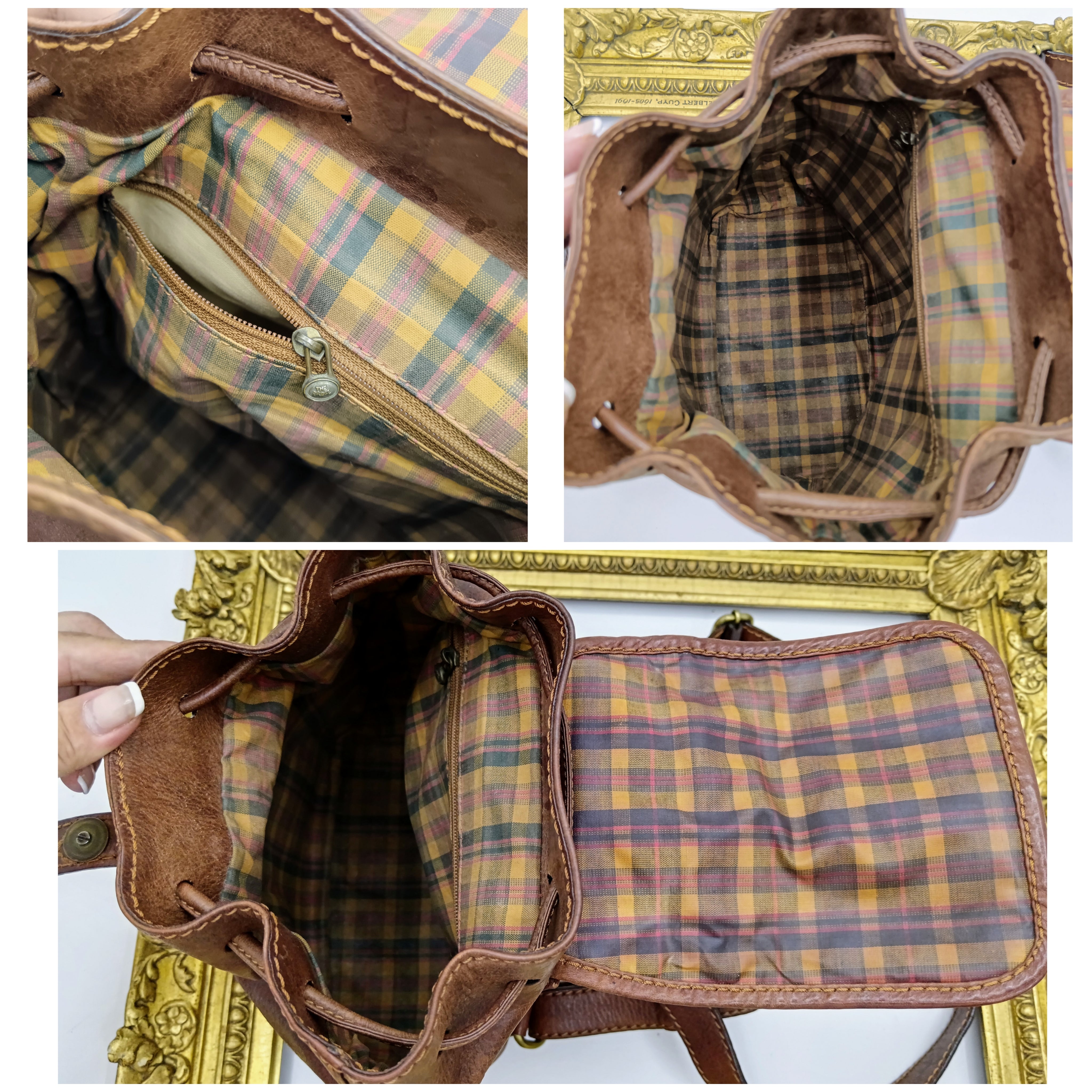 Interno: foderato in tessuto tartan plastificato con tasca interna chiusa da zip